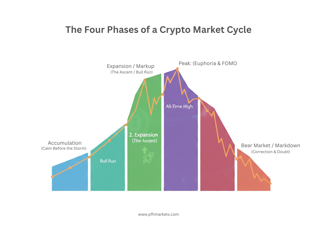 Every crypto market cycle progresses through four distinct phases. Recognizing which phase the market is in helps you adapt your strategy accordingly.