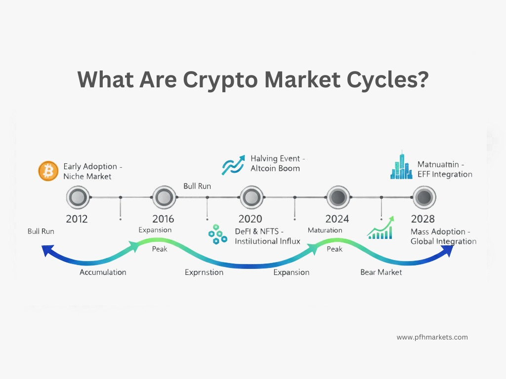 Crypto market cycles are recurring patterns of price movements that characterize the cryptocurrency market, moving through distinct phases of growth (bull market) and decline (bear market). Unlike traditional financial markets that may take decades to complete full cycles, crypto operates on an accelerated timeline, with complete cycles often occurring every 3-4 years.