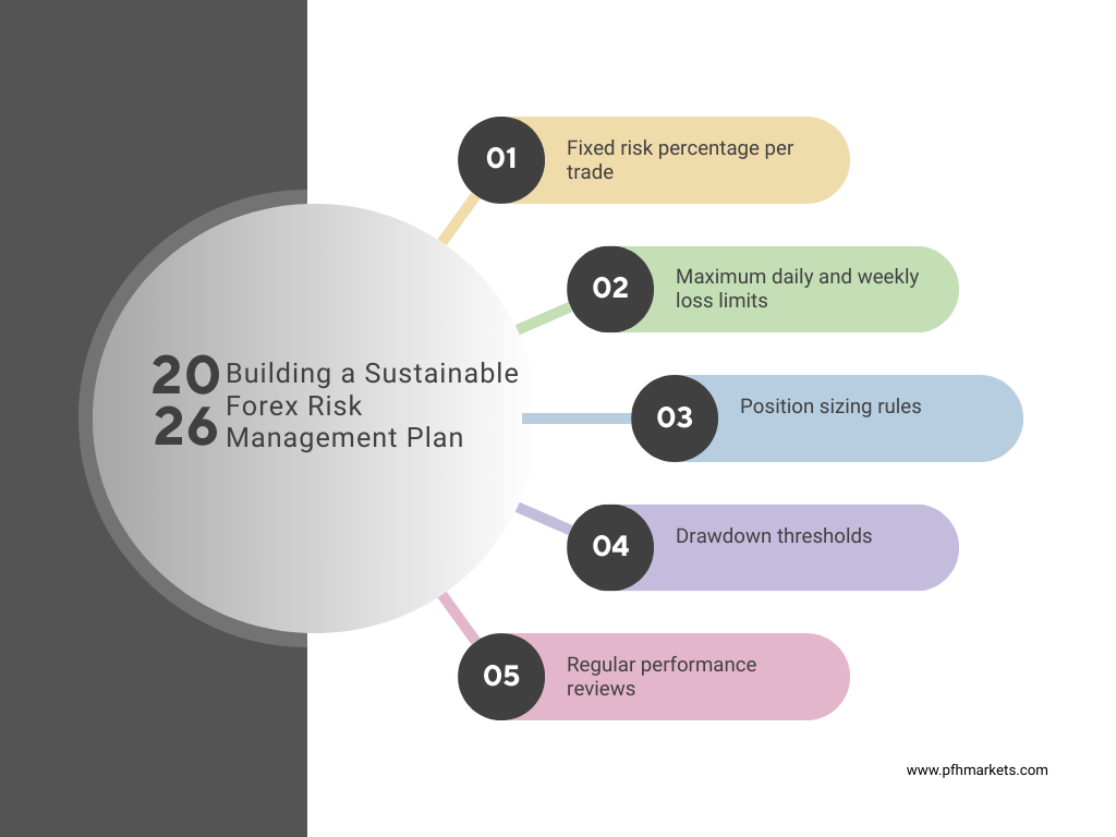 Building a sustainable forex risk management plan for 2026 requires structure, discipline, and consistency. A strong plan defines a fixed risk percentage per trade, sets clear maximum daily and weekly loss limits, and applies consistent position sizing rules to control exposure. It also includes drawdown thresholds to protect capital during losing periods and regular performance reviews to identify strengths and weaknesses over time. Rather than relying on complex systems, traders benefit more from a simple, well-defined plan that is followed consistently.
