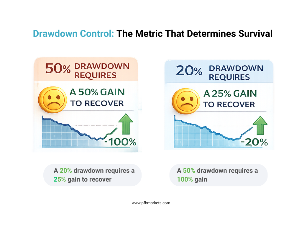 A drawdown refers to the decline in an account’s equity from its highest point to its lowest point during a period of trading. As drawdowns increase, the difficulty of recovering losses grows significantly. For example, a 20% drawdown requires a 25% gain just to break even, while a 50% drawdown demands a 100% gain to recover the original capital. Because of this compounding effect, institutions enforce strict drawdown limits, fully aware of both the mathematical disadvantage and the psychological strain caused by deep losses. Retail traders who ignore drawdown control often leave the market not due to poor strategies, but because sustained