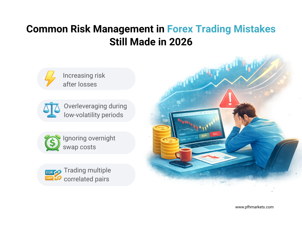 Despite improved education and access to information, many traders in 2026 continue to repeat the same forex risk management mistakes. Increasing risk after losses often leads to emotional decision-making, while overleveraging during low-volatility periods creates unnecessary exposure. Ignoring overnight swap costs can quietly reduce profitability, especially for swing and position traders, and trading multiple correlated pairs can unintentionally multiply risk. These mistakes rarely cause immediate account blow-ups, but they steadily erode capital over time, which is why many traders struggle or exit the market without clearly understanding what went wrong.